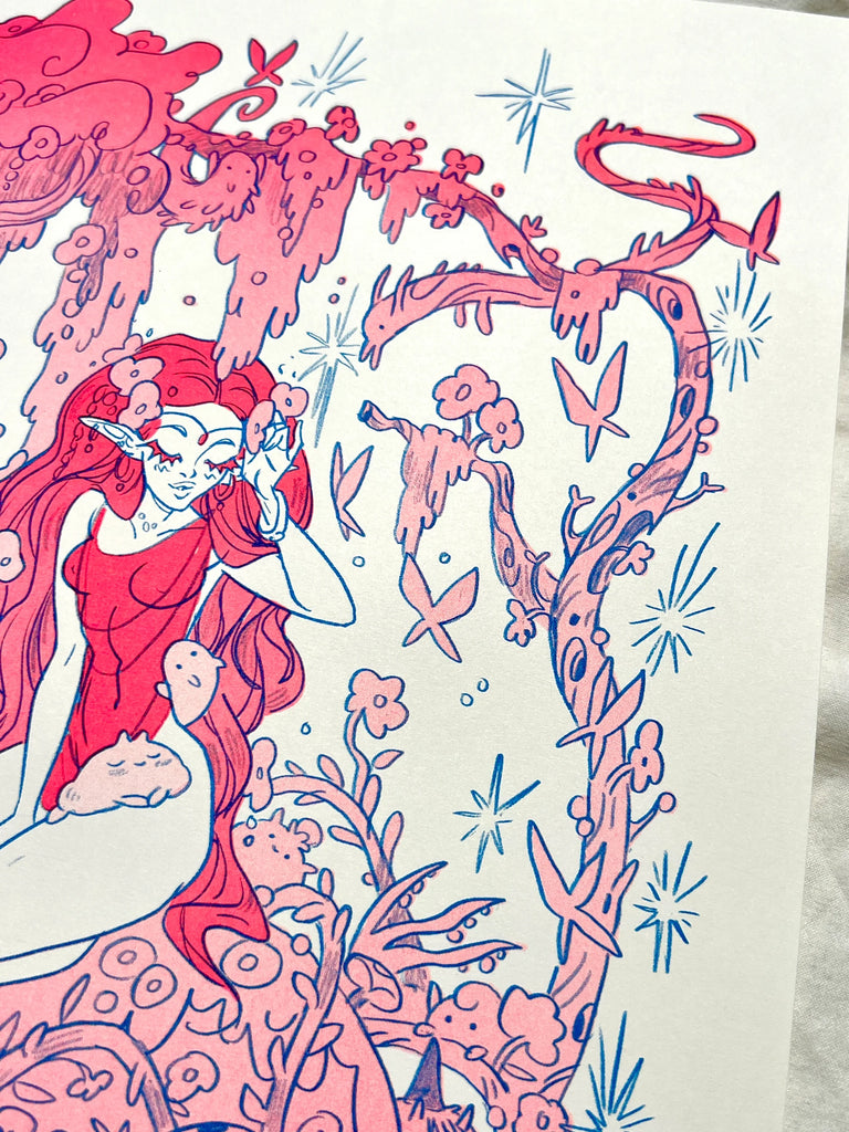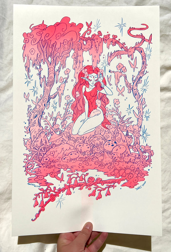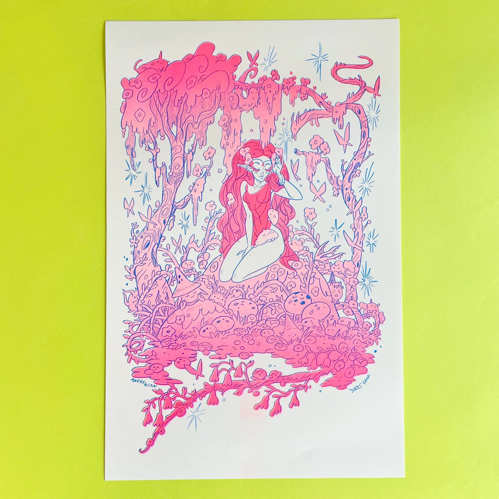 Woodland fairy collab with Natalie Andrewson! Three color Risograph print in fluorescent pink, fluorescent orange and blue for a maximum hot pink look.